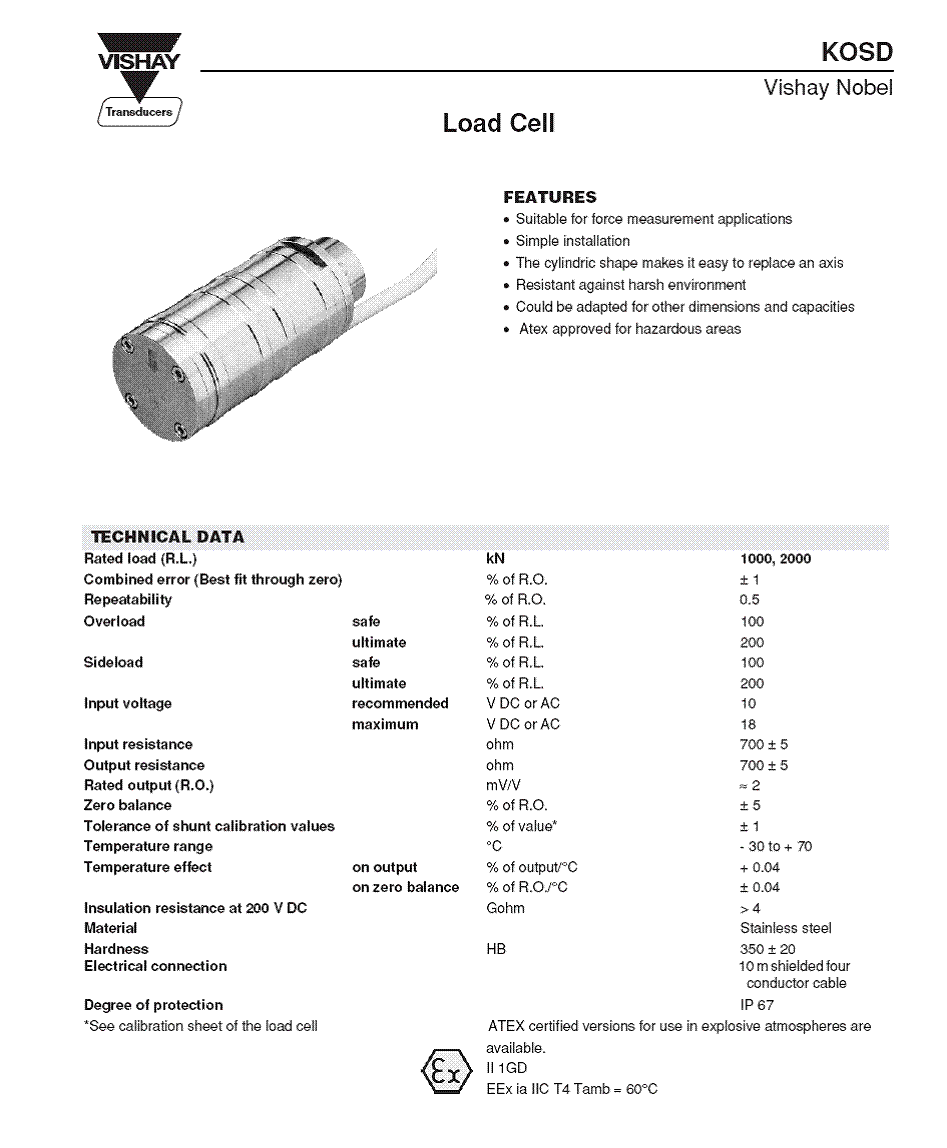 KOSD - 40稱重傳感器具有堅(jiān)固的外殼,適合在惡劣環(huán)境中測(cè)力過(guò)載保護(hù)應(yīng)用。敏感元件包括三個(gè)部分,兩外部分構(gòu)成支持,中間部分是負(fù)載傳感的一部分。