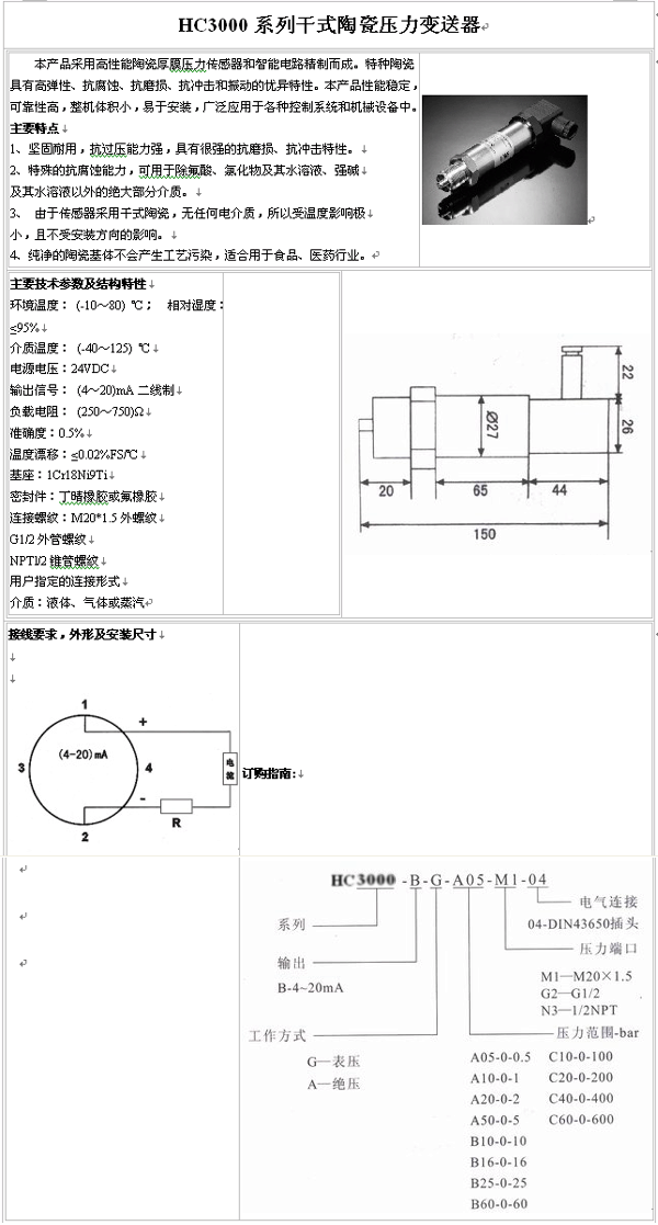 HC3000系列 干式陶瓷壓力變送器(pressure sensor):
